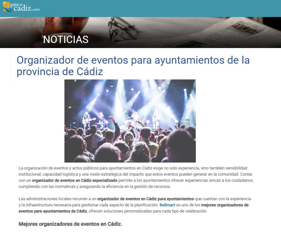 Las administraciones locales recurren a un organizador de eventos en Cádiz para ayuntamientos que cuentan con la experiencia y la infraestructura necesaria para gestionar cada aspecto de la planificación. Bellmart es uno de los mejores organizadores de eventos para ayuntamientos de Cádiz, ofrecen soluciones personalizadas para cada tipo de celebración.